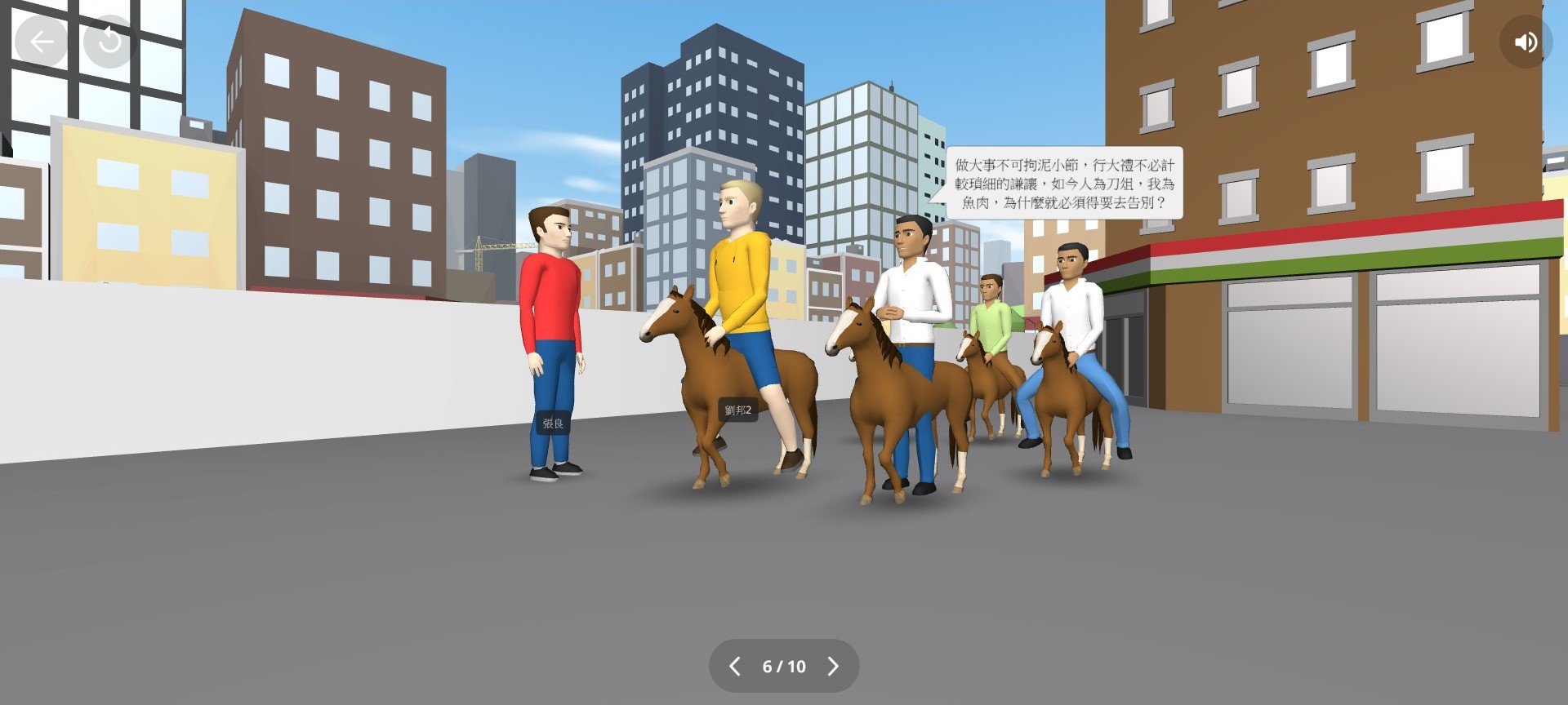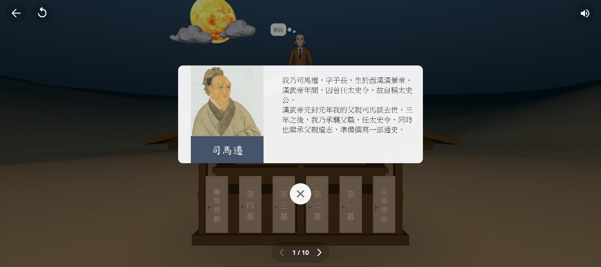 - 遊戲介紹:秦末之際,群雄並起,在這鴻門之地有場為人津津樂道的宴席──鴻門宴。本遊戲將鴻門宴濃縮成簡短的互動遊戲,主要適用於高中三年級之學生或欲熟知〈鴻門宴〉此篇古文內容之學習者。 操作者可以藉由觀看故事內容,加以了解鴻門宴的事件發生始末,並藉由遊戲情節中的互動增添樂趣。